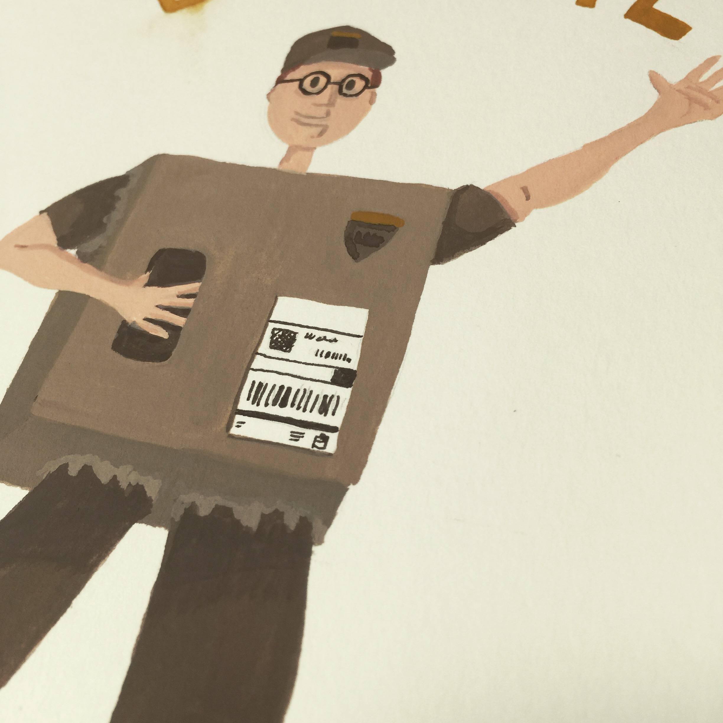 An illustrated greeting card design featuring a delivery person (UPS) wearing a parcel (box) with the phrase “Special Delivery”.
