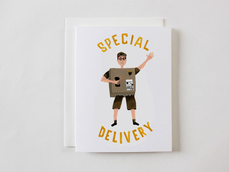 An illustrated greeting card design featuring a delivery person (UPS) wearing a parcel (box) with the phrase “Special Delivery”. Coordinating envelope is included.