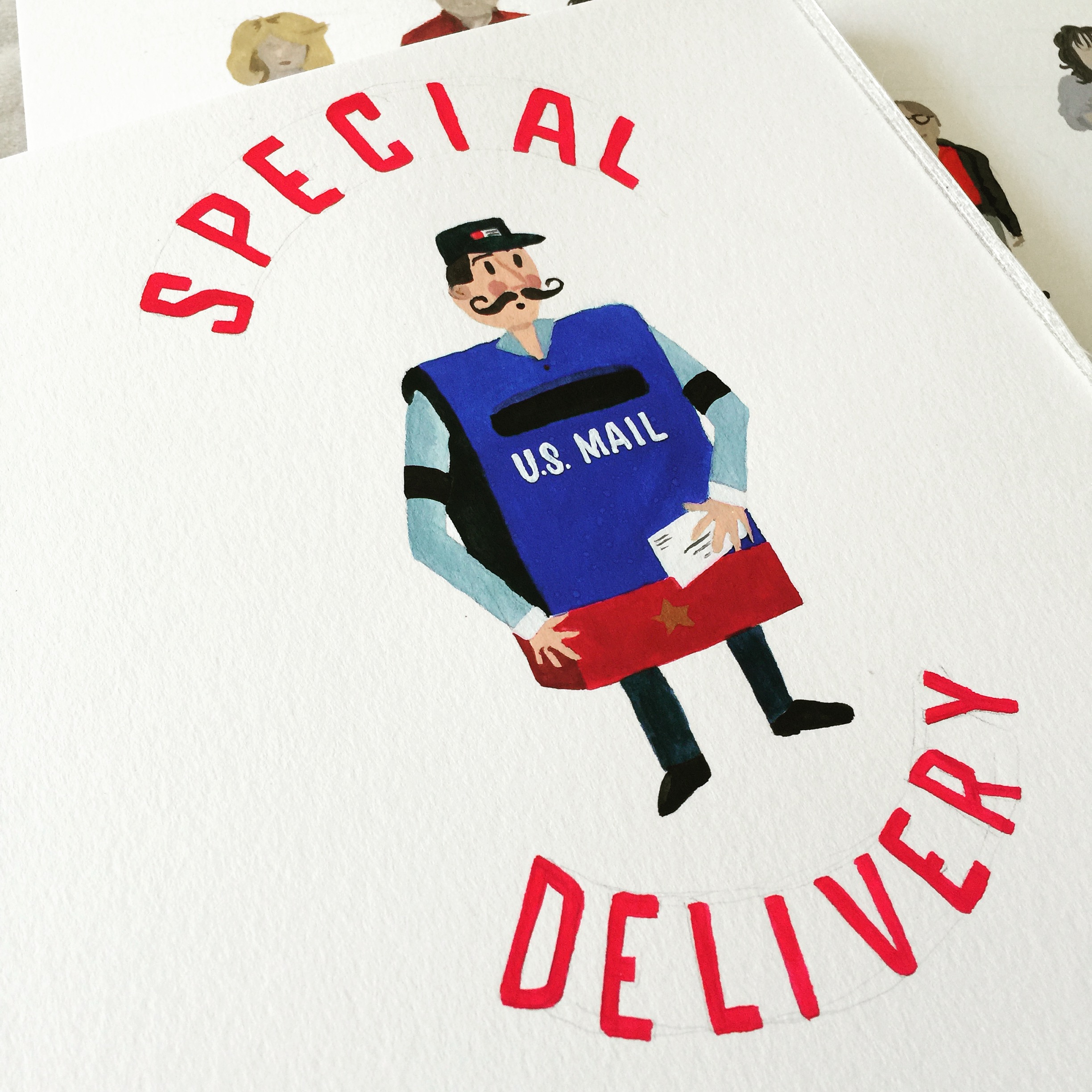 An illustrated greeting card design featuring a unique postal worker with a mailbox for a body with the phrase “Special Delivery”. Coordinating envelope is included.